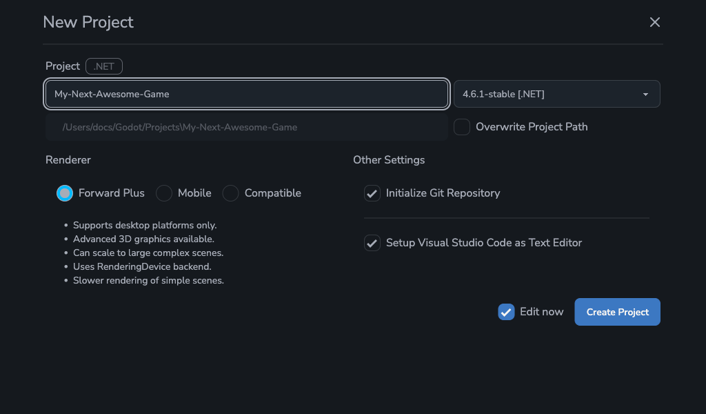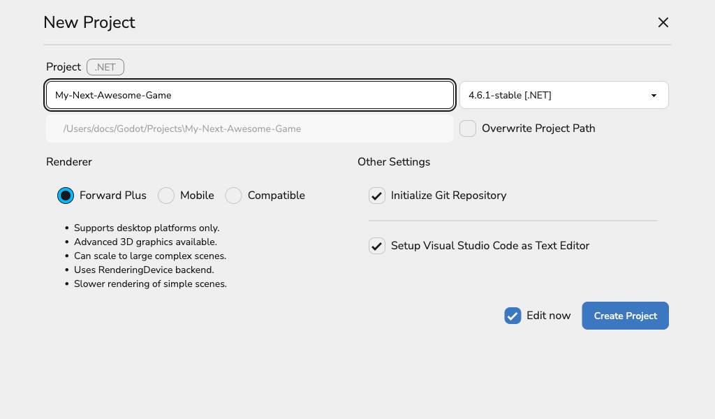 project.godotfiles into the Projects list to add them quickly with visible progress. - Flexible Project Location – Create a new project in your default Projects folder or temporarily override the path for one project when your workflow needs it.