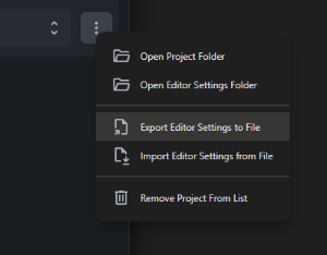 The launcher provides built-in options to import or export editor settings for each project. This is useful for migrating settings, keeping consistency across machines, or sharing configurations in a team.